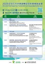 (二)另於開展首日(11月27日)於爭豔館「花開講堂」舉辦, 2025全球花卉供應鏈轉型與新興機會論壇(詳如活動簡介),邀請國內外學者與產業代表,共同探討全球花卉產業鏈在消費趨勢與市場變遷下的影響,分享臺灣及鄰近花卉生產國的布局策略與因應策略。 二、展覽入場方式:11月27日僅開放花卉園藝從業人員等專業人士及機關學校團體入場,個人可憑花卉園藝從業名片等兌換參觀證入場。團體參觀預約請洽該會王小姐(電話:02-87922399分機312)。另11月28日至30日開放一般民眾自由入場參觀。 |
