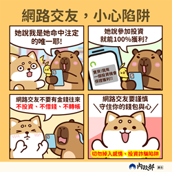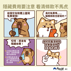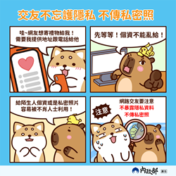 二、為提升全民對交友服務之正確消費觀念,內政部製作圖卡及影片,提醒消費者小心謹慎,落實交友服務消費者保護。