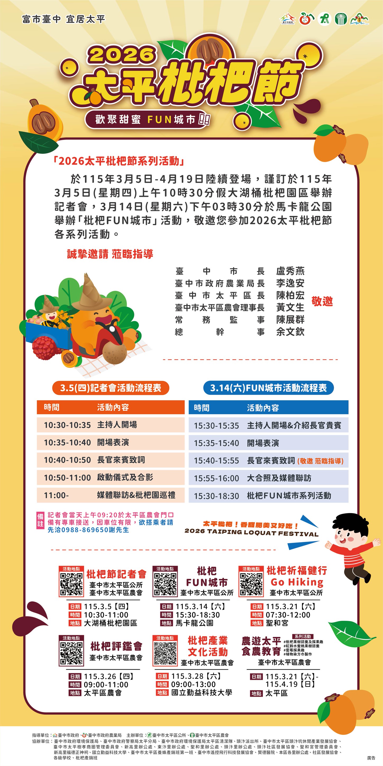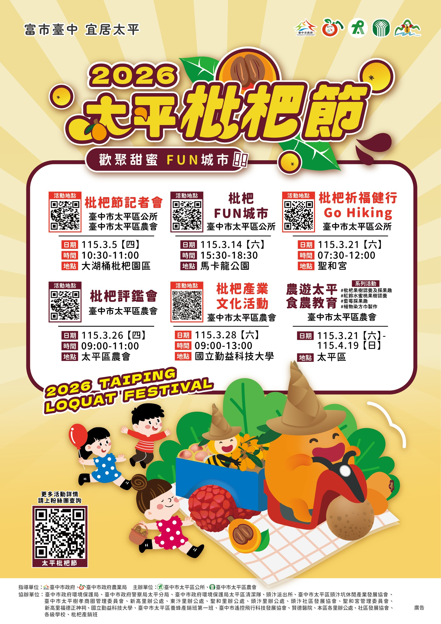 臺中市太平區公所辦理「2026太平枇杷節」系列活動,附件為邀請卡、海報及宣傳單電子檔各1份,供民眾自行下載參閱。