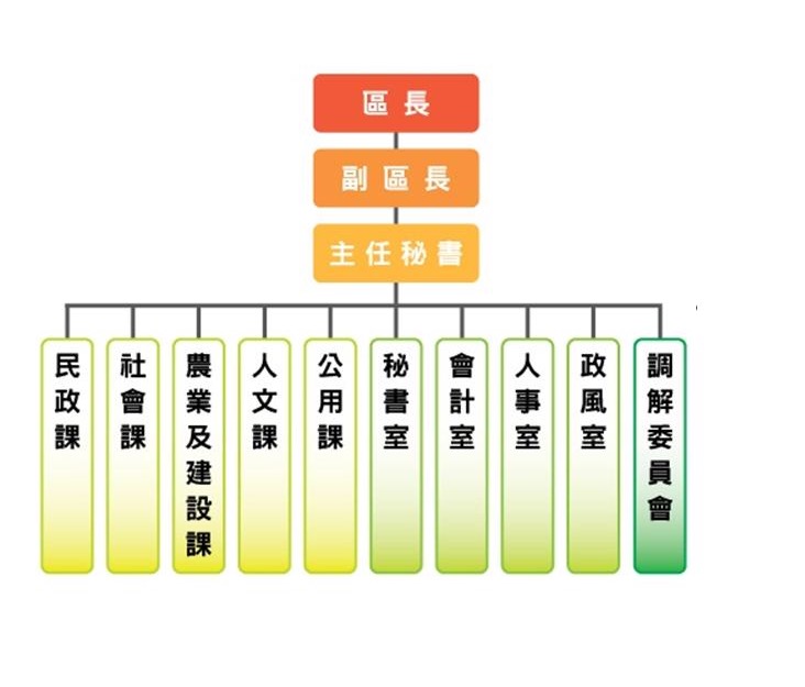 本公所設置區長1名,副區長1名,主任秘書1名,其下設有民政課、社會課、農業及建設課、人文課、公用課、秘書室、會計室、人事室、政風室及調解委員會。